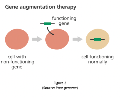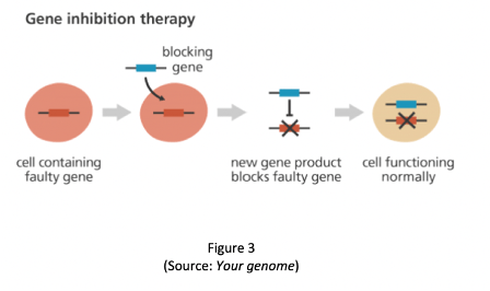 Additionally, various techniques are being used in gene therapy. One such technique is gene augmentation therapy (6). This technique can be used to treat genetic abnormalities that stem from mutation, where the gene in question does not produce its functional products (6, 7). As shown in figure 2, this therapy adds the DNA containing a functional gene back into the cell that is defective and ultimately, can reverse the abnormality (8). Another technique involves gene inhibition (6). This technique can be used in pathologies in which the overexpression of certain genes is causing the disease. In this approach, the aim is to introduce a new gene that either inhibits the expression of another faulty gene, or interferes with the activity of the product produced by the faulty gene (9), as shown in figure 3.