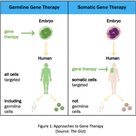 Now you may be wondering to yourself, how is genetic therapy actually done? Generally speaking, gene therapy involves the identification of cell types and DNA sequences that are defective, and then introducing a new DNA sequence containing the functional genes to offset the effects of the disease-causing genetic alterations (5). There are two different approaches to gene therapy (figure 1), and these involve alterations of different types of cells (6). Somatic gene therapy involves the transfer of DNA to different cells in our body that do not produce sperm or eggs. Given that these changes are not in the germline, any DNA alteration cannot be passed on from parents to their children (6). In contrast, germline gene therapy involves the transfer of DNA to cells that produce eggs or sperms, meaning these changes can be inherited (6).