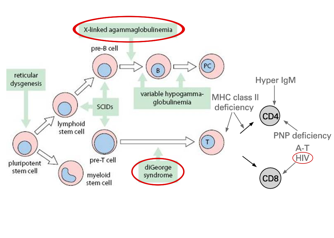 Figure 1. Adapted flowchart of B-cell and t-cell development in the adaptive immune system, indicating stages where development or function are impacted by common primary and secondary immune deficiencies. XLA, diGeorge Syndrome, and HIV are circled in red. SCID: severe combined immune deficiency; PNP; purine nucleoside phosphorylase; MHC: major histocompatibility complex; BM: bone marrow; A-T and HIV infection affect mature T cells (8).